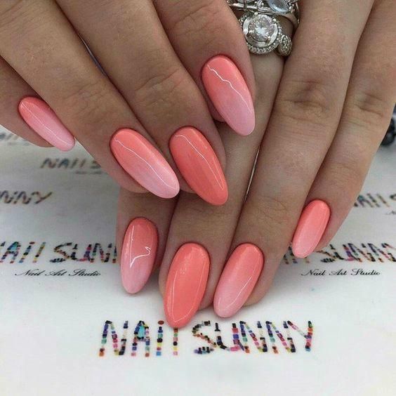 - Любым удобным способом делаем омбре. Сперва наносим зеленый цвет, затем коралловый и розовый. Растушевываем границы при помощи спонжика или кисти для градиента гель-лаком. Если используется губка, то просто делаем отпечаток на ногтевой пластине.