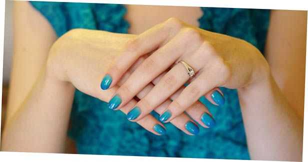 Легче всего выполняется градиент одним цветом лака разной тональности, которые смешиваясь не дают неприятный оттенок.