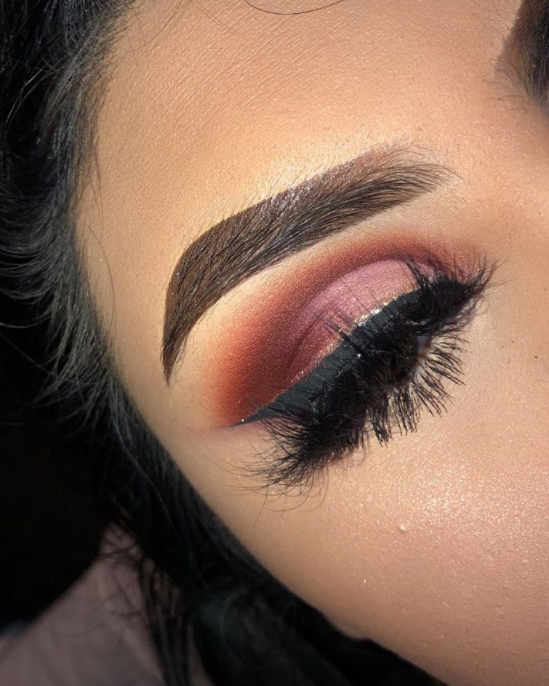 Широка дуга, выполненная в темно-коричневом тоне, откроет внимание на верхнее веко глаза. Что поможет визуально увеличить их