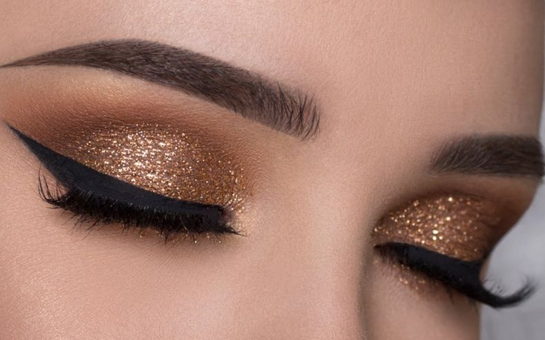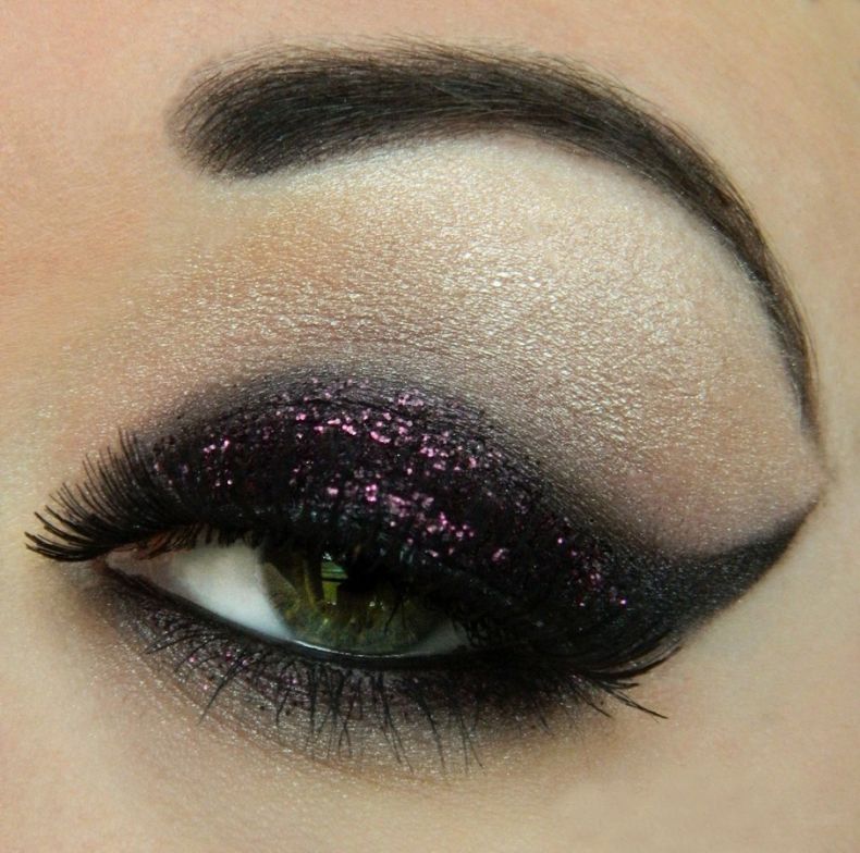 - Блестки. Этот макияж немного необычный, но весьма эффектно преобразит внешность. Брови покрываются плотным слоем блестящего глиттера, серебро, золото — это дело вкуса. Такие брови смогут себе позволить самые смелые модницы, в любом случае отличный вариант для вечеринок.