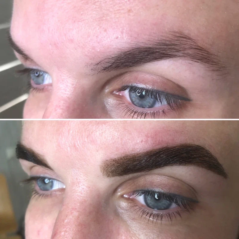 - Нужно сбрить волоски и подготовить участок нанесения макияжа. Для этого его необходимо промыть мицеллярной водой, нанести базу и тональный крем. Если кожа жирная, то лучше использовать пудру – чтобы карандаш не потек;