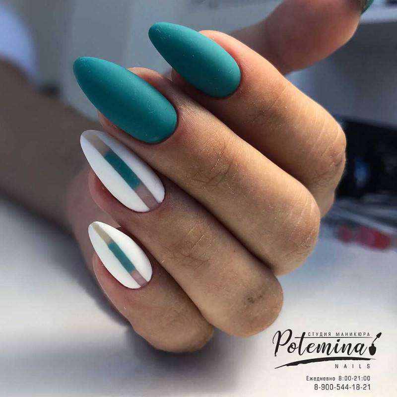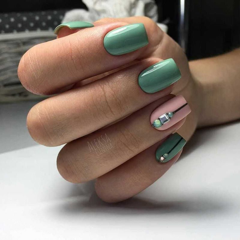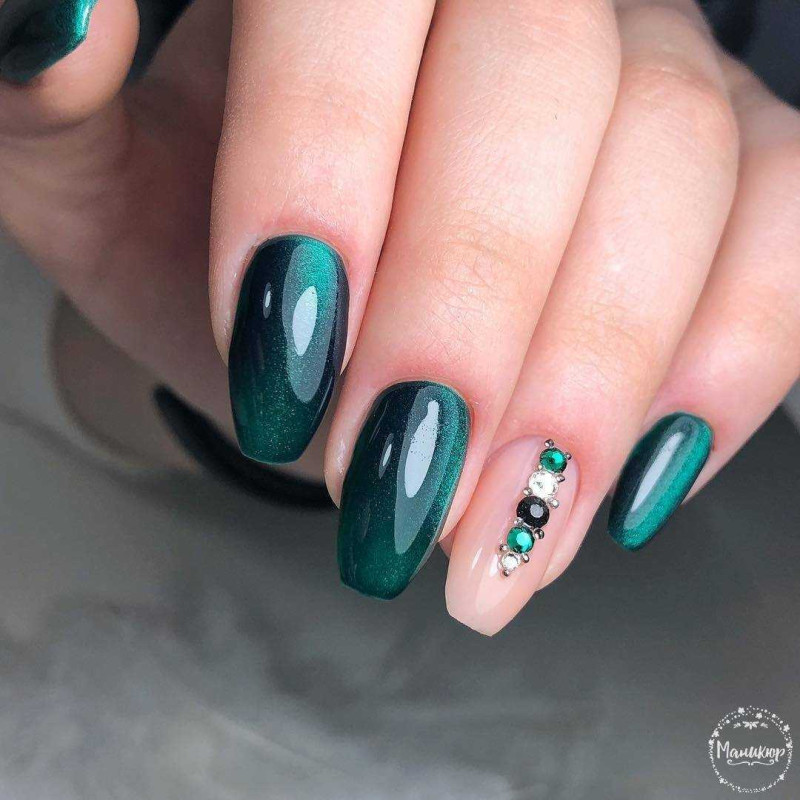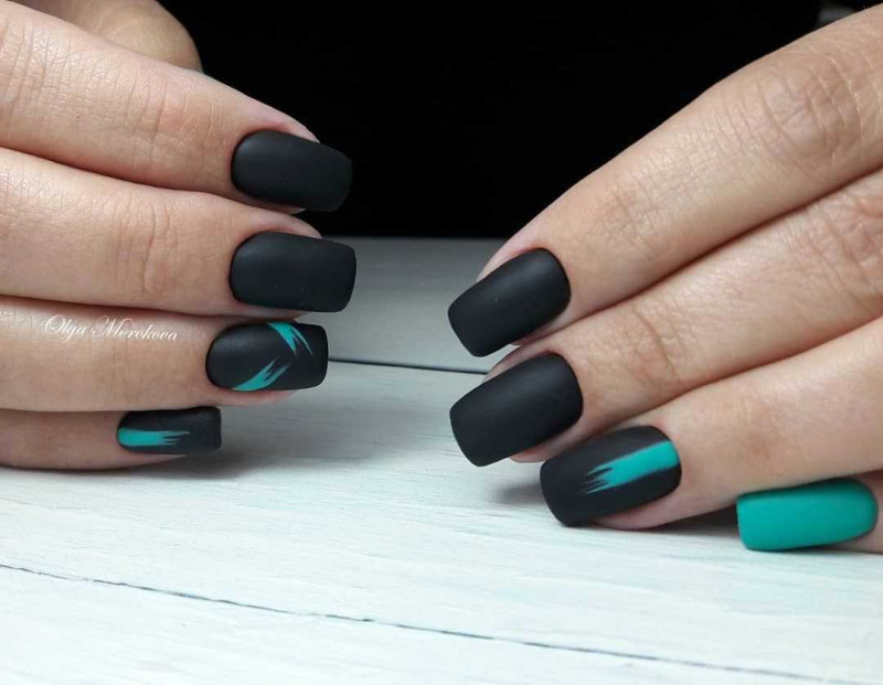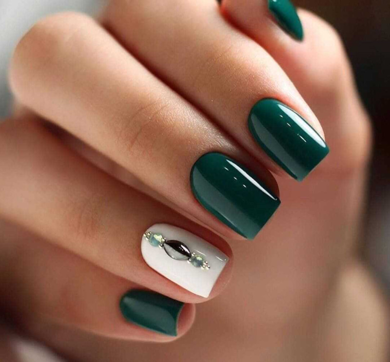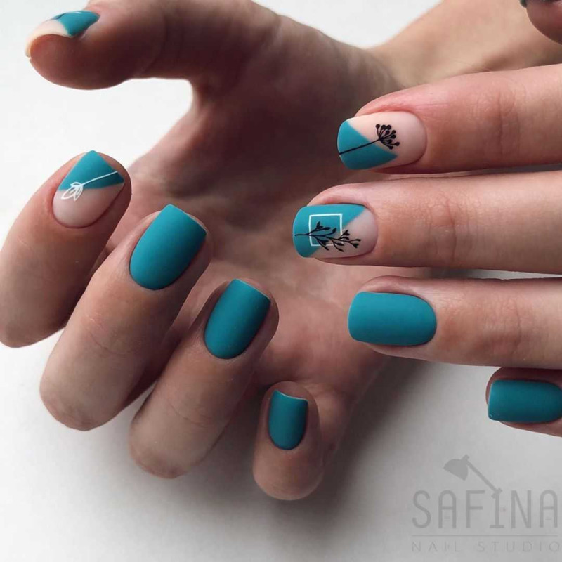 Еще один идеальный оттенок геля для коротких осенних ногтей — апимариновый зеленый. Мастера ногтевого сервиса рекомендуют сочетать его с черным, серым и желтым. Отличная идея для простого дизайна — матовая обложка. Благодаря этому ногти выглядят бархатистыми и, благодаря темному оттенку, не такими зараженными, как белые матовые ногти.