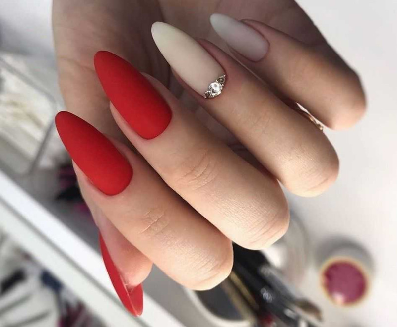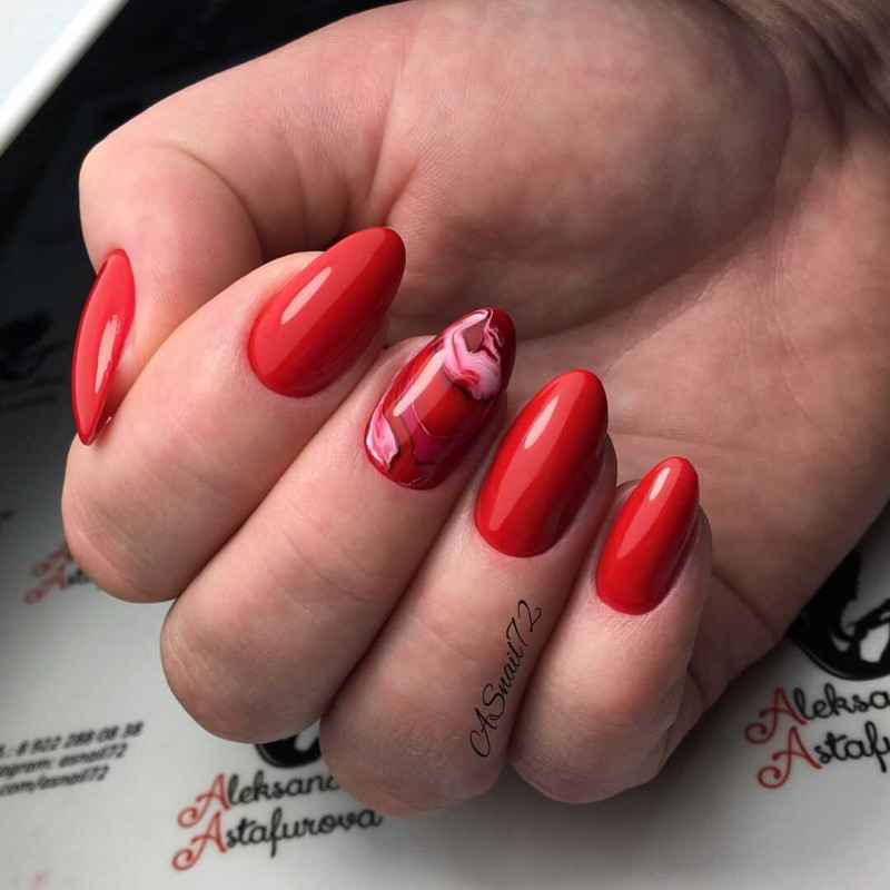 Что касается красного цвета, то он более яркий и используется немного реже. Однако это не значит, что от него стоит отказываться. Напротив, это актуальный цвет 2020 года и он уместен абсолютно в любом сезоне. Многие нейл-мастера используют красный цвет, как основное покрытие и базу для рисунка. К примеру, цветочный принт и геометрия на таком фоне выглядят идеально. Кроме того, он также часто является акцентом в более светлом маникюре. То есть его наносят буквально на несколько ноготков и украшают стразами, блестками.