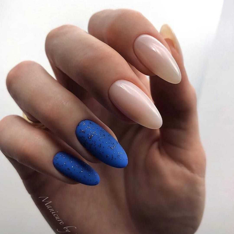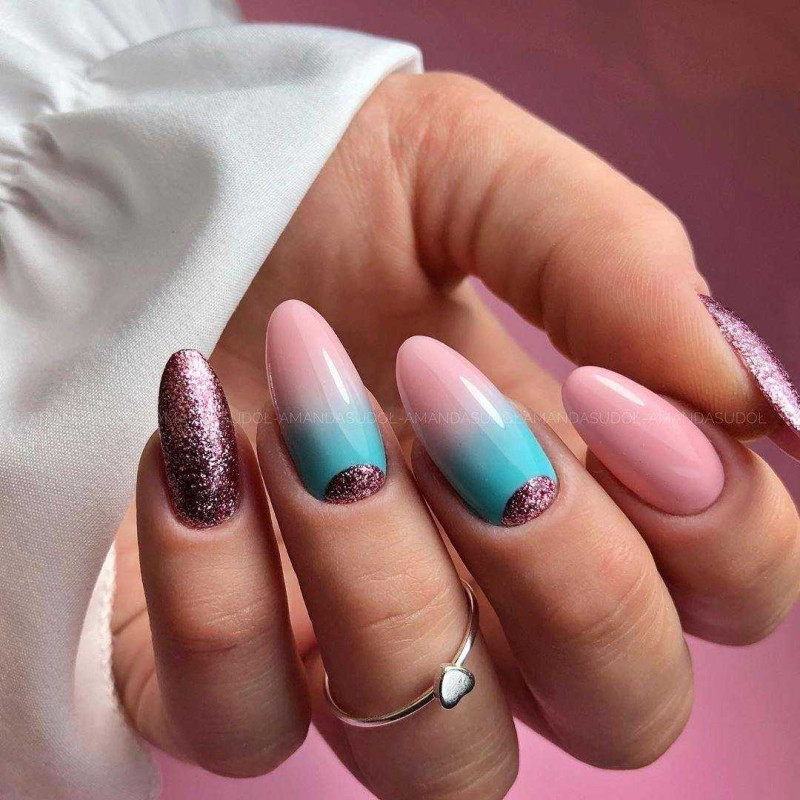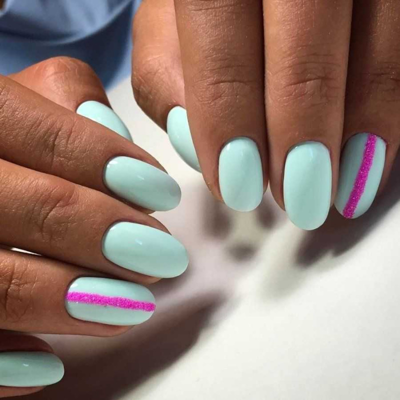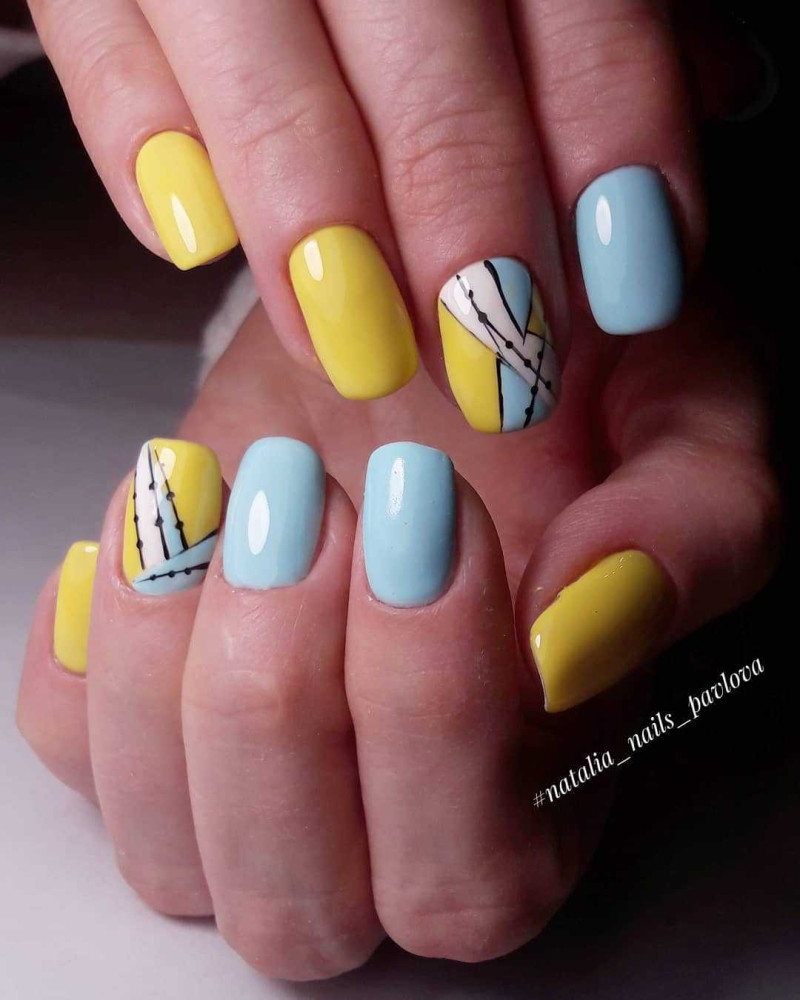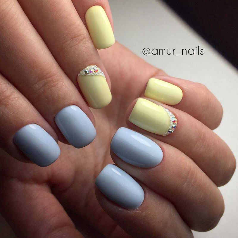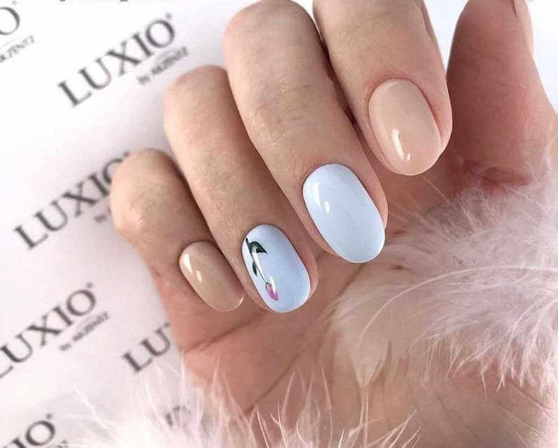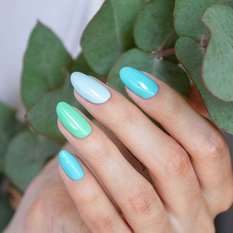 Такое сочетание отлично смотрится в деловых и повседневных нейл-артах. Например, выберите в качестве основного голубой оттенок и ориентируясь на цветовую схему, создайте красивое градиентное оформление на каждом ноготке.