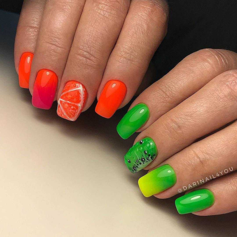 Для летнего маникюра характерны яркие сочные краски. Можно использовать любую технику nail art для создания уникального дизайна. Подойдет абстракция, цветочный принт, градиент, френч и другие стили. Используют пляжные мотивы, фруктовый микс.