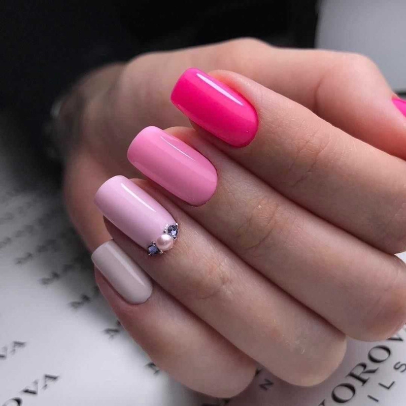 Маникюр с разными оттенками гель-лака на каждом пальце пользуется огромной популярностью в летние сезоны. В таком дизайне можно сочетать до 5-ти разных цветов, при этом они смотрятся лаконично в одном нейл-арте. Чаще всего при создании разноцветного маникюра вообще не учитываются никакие правила колористики. Для тех, кому ближе гармония, предлагаем воспользоваться монохромным сочетанием. Это позволит создать мягкий градиентный эффект с «растяжкой» по всем ноготкам.