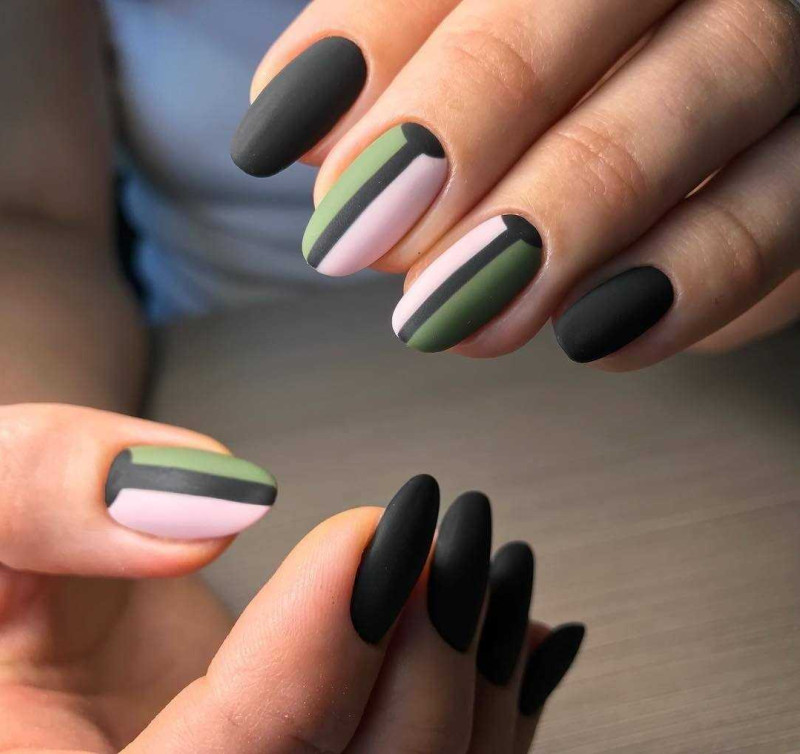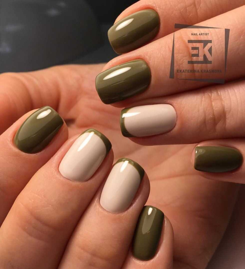 - Лидирующими станут вся зеленая цветовая гамма и цвет хаки для дизайна ногтей.
