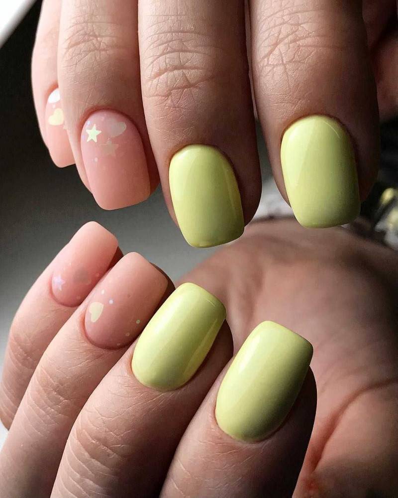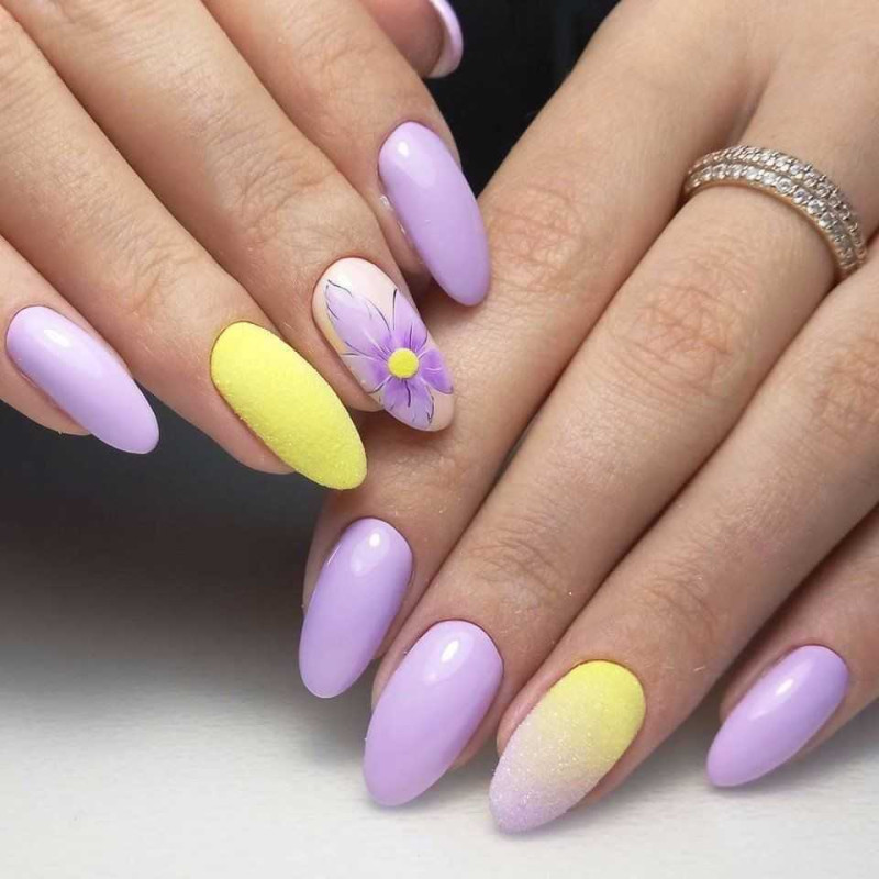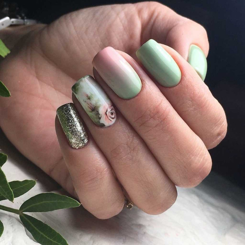 В весеннее время в тренде флористические мотивы. Выбирают нежные пастельные тона, например: сиреневый, нежно-желтый, мятно-зеленый. Можно рисовать цветочные узоры на базовом покрытии пастельного тона, можно использовать наклейки или стемпинг. Неплохо будет смотреться градиент из весенней цветовой гаммы. Посмотрите некоторые идеи для вдохновения на примере фото.