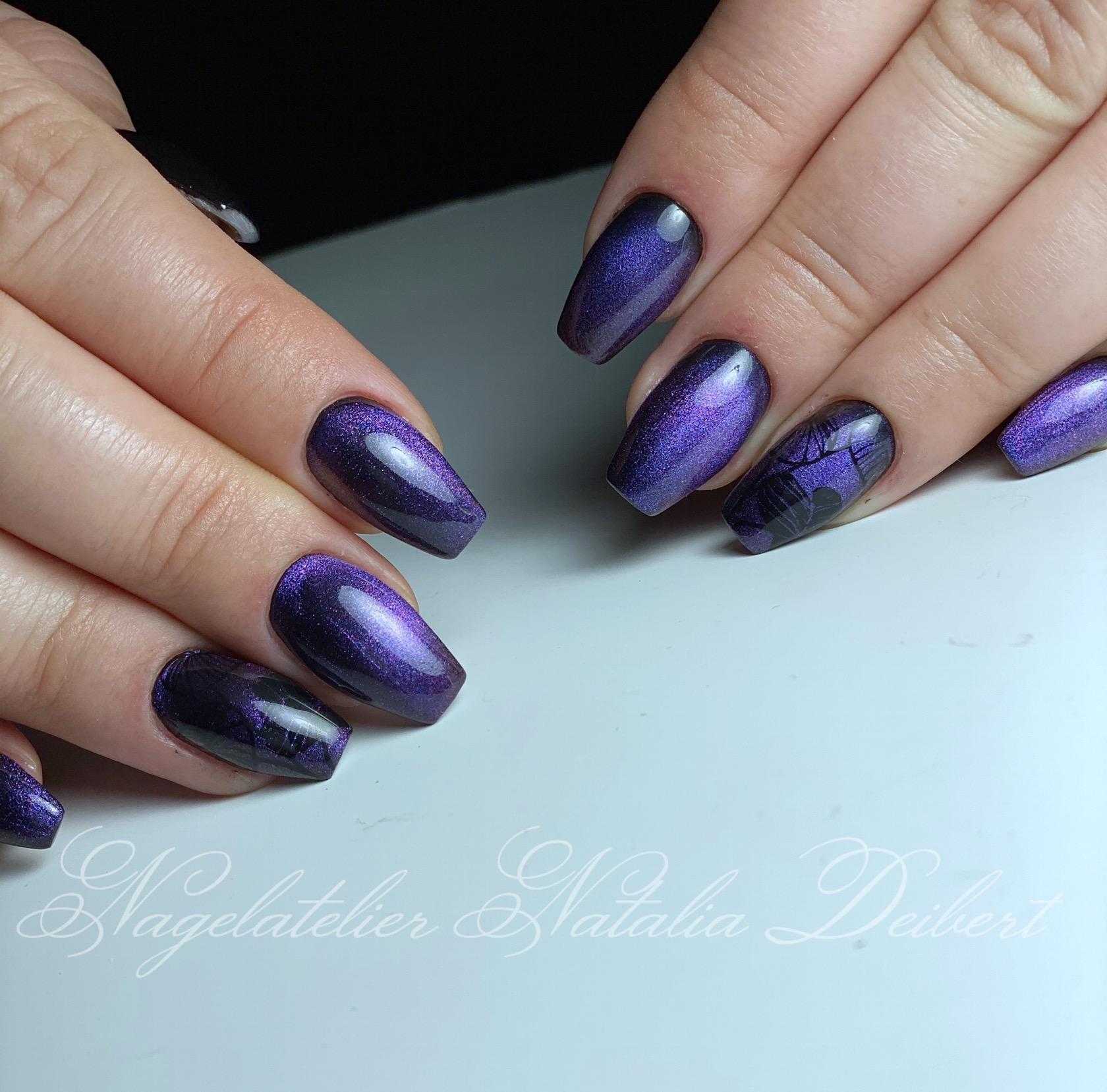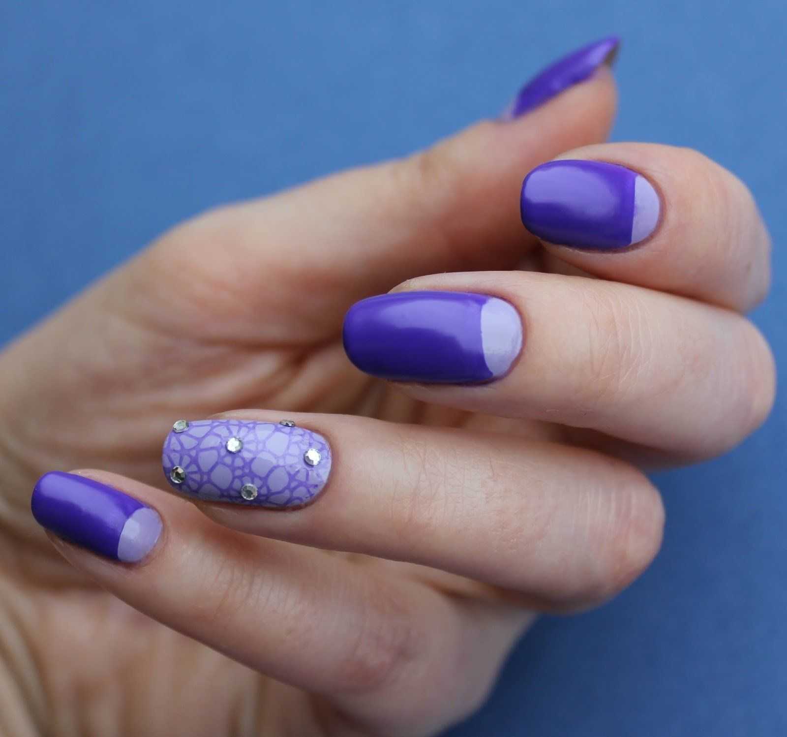 Красивый праздничный маникюр на короткие ногти получается, если дополнить сине-фиолетовый оттенок блестками – покрыть ими все ногти или перекрыть плотным слоем только один пальчик.