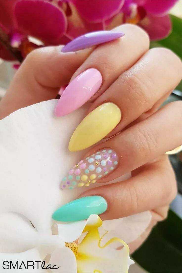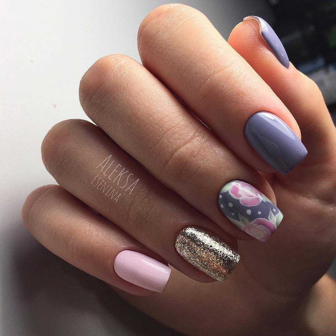 В весеннее время в тренде флористические мотивы. Выбирают нежные пастельные тона, например: сиреневый, нежно-желтый, мятно-зеленый. Можно рисовать цветочные узоры на базовом покрытии пастельного тона, можно использовать наклейки или стемпинг. Неплохо будет смотреться градиент из весенней цветовой гаммы. Посмотрите некоторые идеи для вдохновения на примере фото.