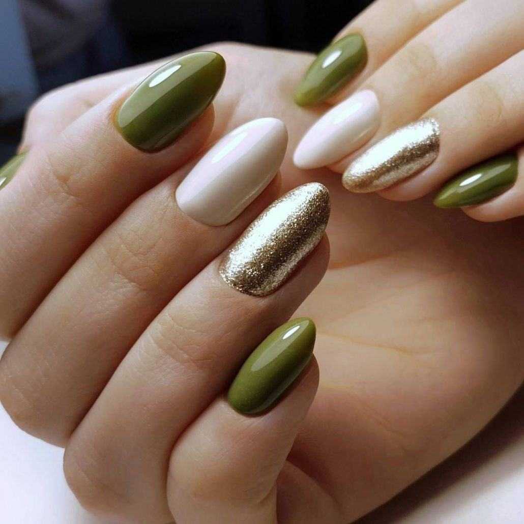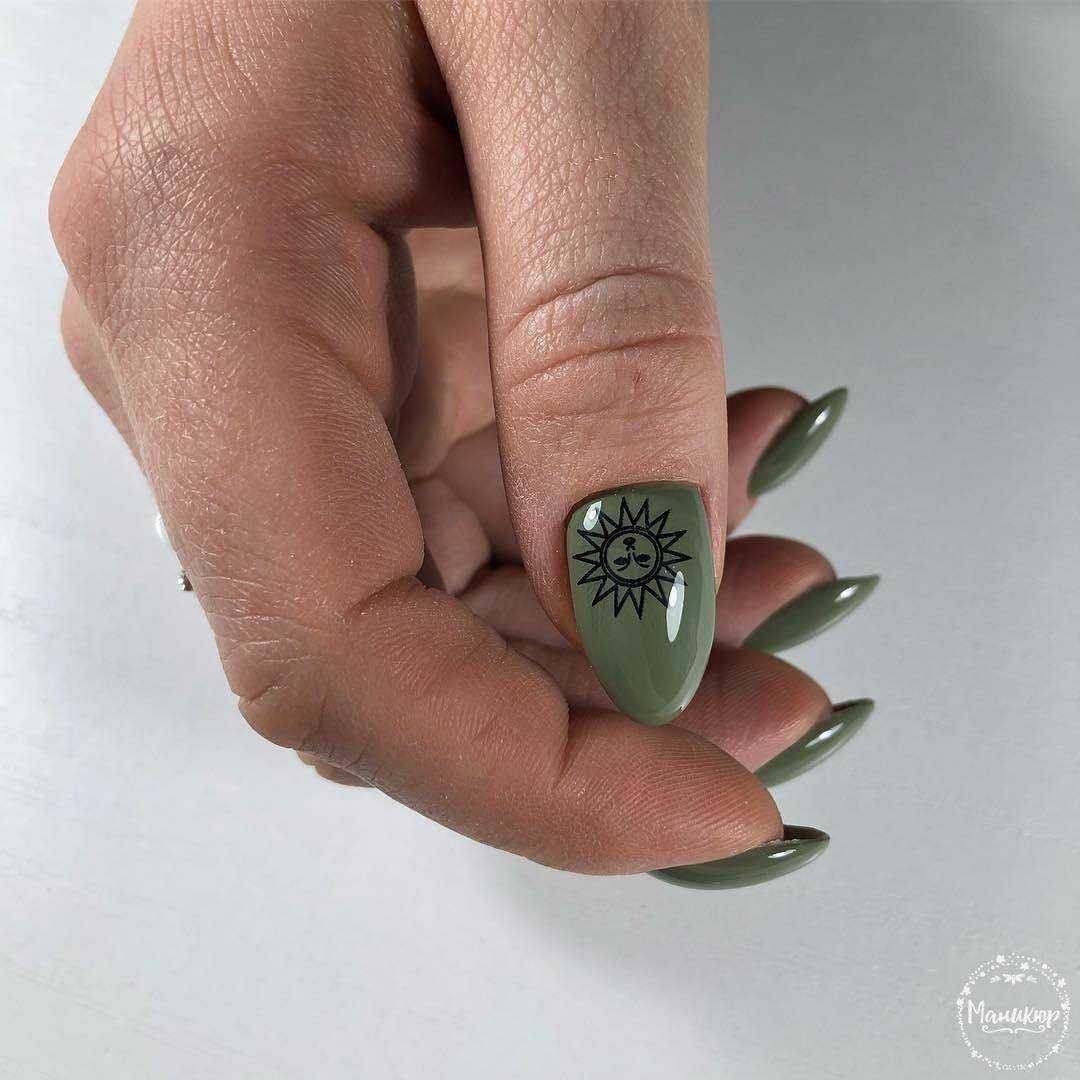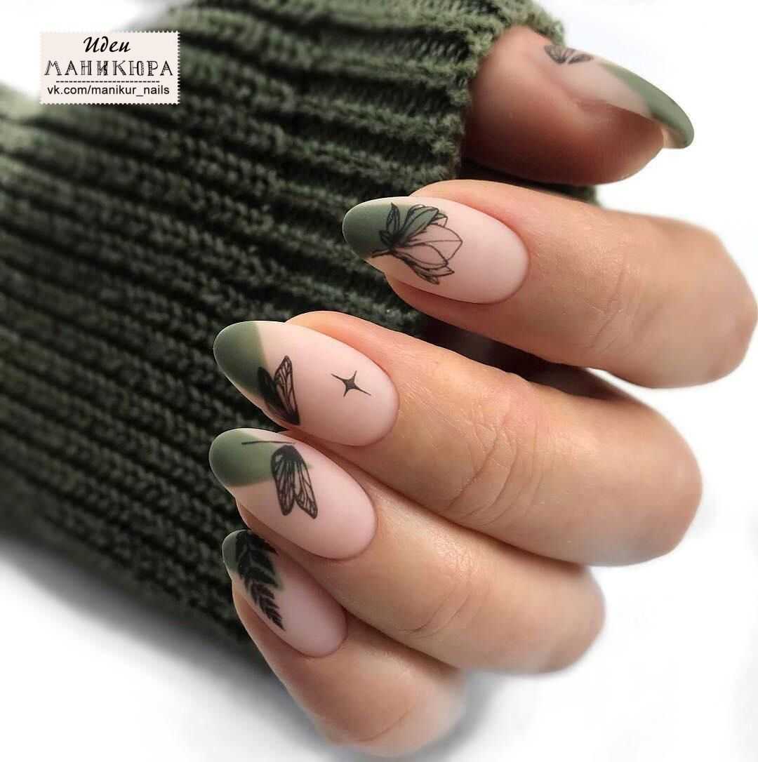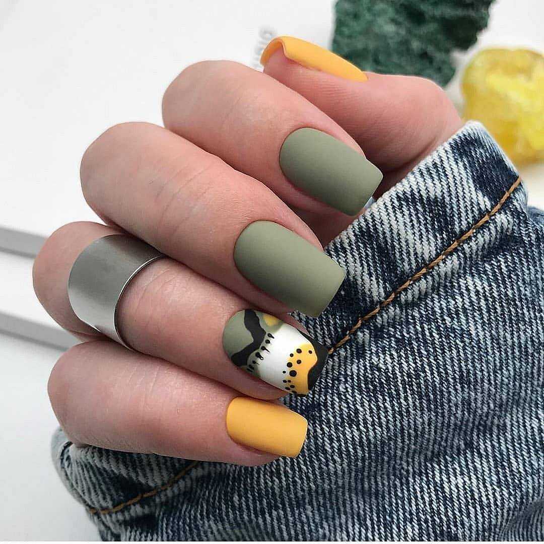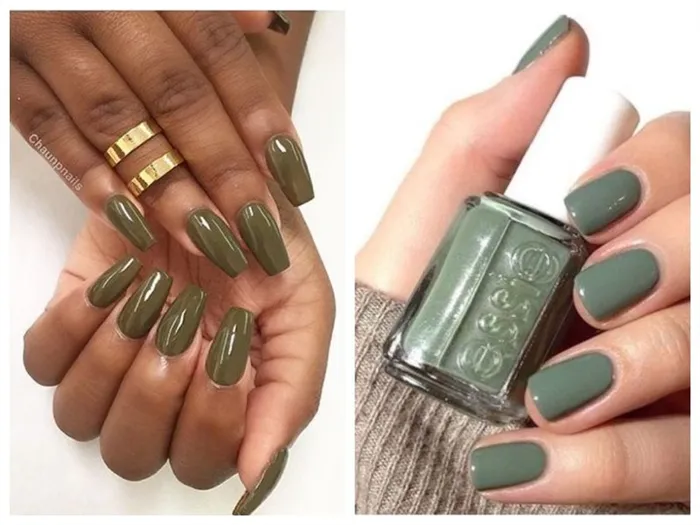 - Лидирующими станут вся зеленая цветовая гамма и цвет хаки для дизайна ногтей.