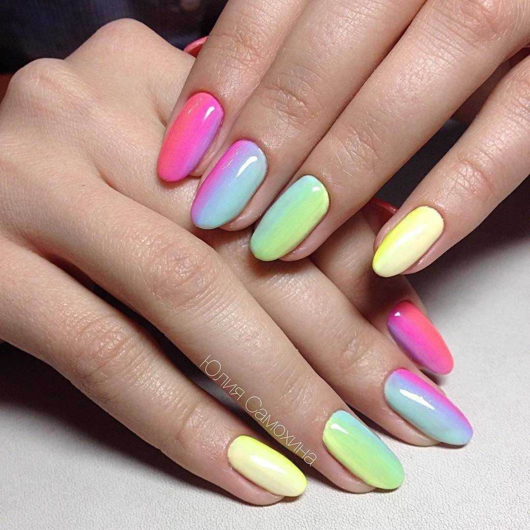 Маникюр с разными оттенками гель-лака на каждом пальце пользуется огромной популярностью в летние сезоны. В таком дизайне можно сочетать до 5-ти разных цветов, при этом они смотрятся лаконично в одном нейл-арте. Чаще всего при создании разноцветного маникюра вообще не учитываются никакие правила колористики. Для тех, кому ближе гармония, предлагаем воспользоваться монохромным сочетанием. Это позволит создать мягкий градиентный эффект с «растяжкой» по всем ноготкам.
