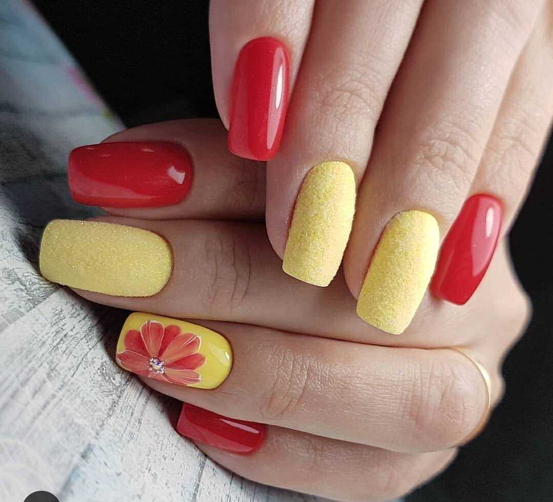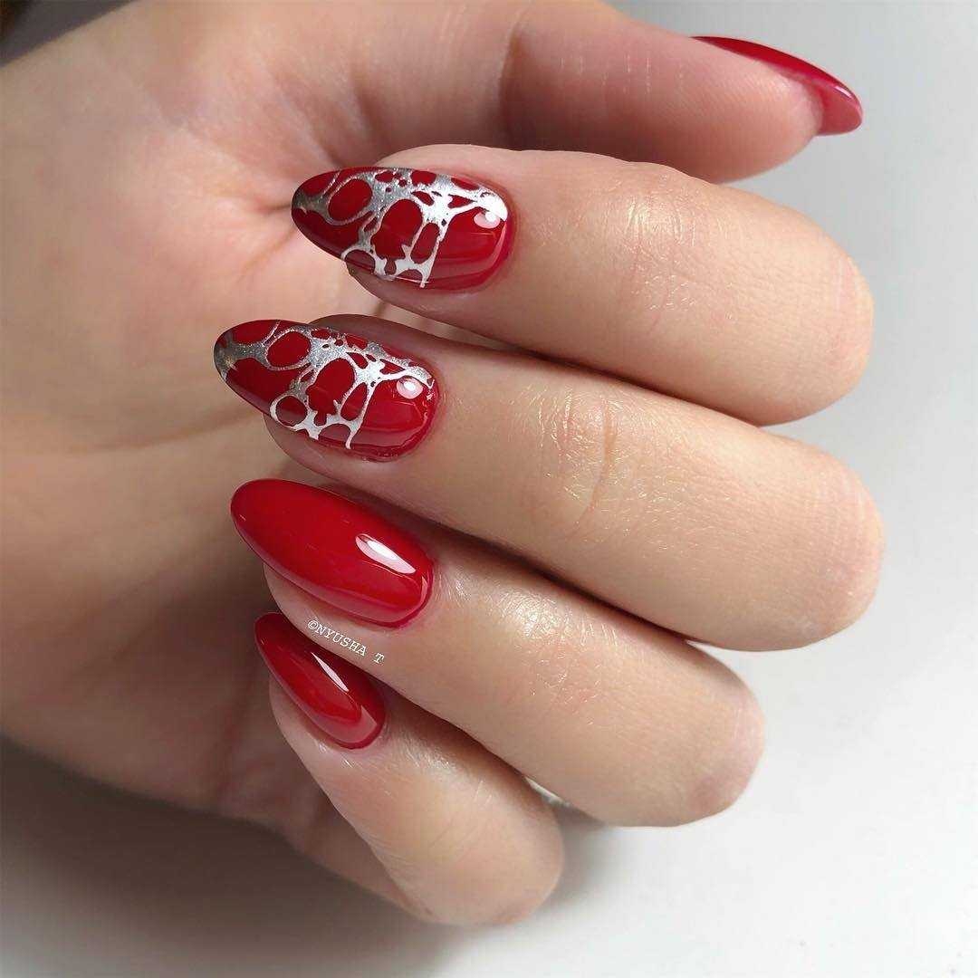 Что касается красного цвета, то он более яркий и используется немного реже. Однако это не значит, что от него стоит отказываться. Напротив, это актуальный цвет 2020 года и он уместен абсолютно в любом сезоне. Многие нейл-мастера используют красный цвет, как основное покрытие и базу для рисунка. К примеру, цветочный принт и геометрия на таком фоне выглядят идеально. Кроме того, он также часто является акцентом в более светлом маникюре. То есть его наносят буквально на несколько ноготков и украшают стразами, блестками.