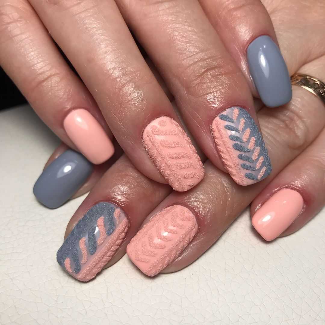 А какие возможности открываются в таком сочетании при создании рисунков! Точки и полоски, геометрия и мраморные разводы, флористика и абстракция. Всё только для вас, прекрасные дамы. Очень эффектно смотрятся объёмные изображения, к примеру, «вязаный» дизайн в матовом исполнении, с жемчужной втиркой или на блестящей подложке из серебра. Он особенно популярен в прохладное время года и прекрасно подходит для завершения новогоднего образа. А также рисунки акриловой пудрой с цветным пигментом в тон общему оформлению или «пушистые» композиции из флока, которые прекрасно украсят как все ногтевые пластины, так пару акцентных пальчиков.