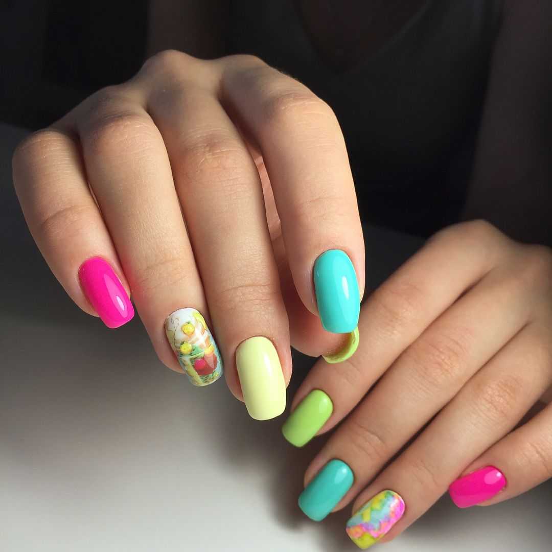 Для летнего маникюра характерны яркие сочные краски. Можно использовать любую технику nail art для создания уникального дизайна. Подойдет абстракция, цветочный принт, градиент, френч и другие стили. Используют пляжные мотивы, фруктовый микс.