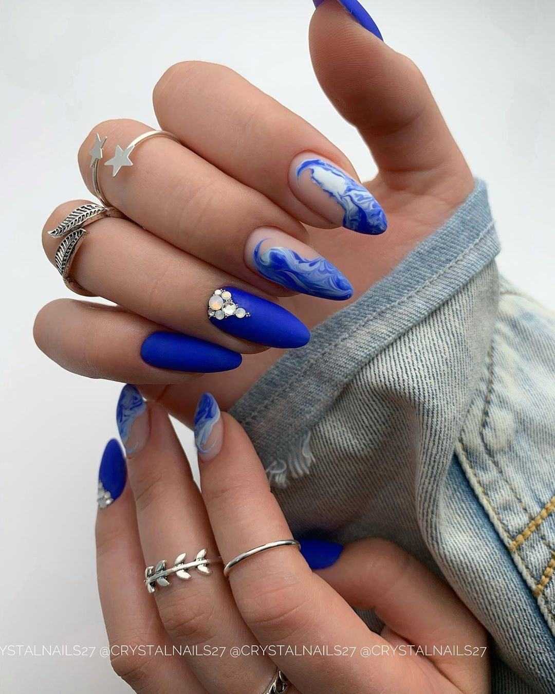 Основные цвета 2021 года продолжают расти до даты выполнения маникюра. Классический синий оттенок длинных ногтей для длинных ногтей используется в качестве дополнительного элемента дизайна. Длинные синие ногти выглядят очень вызывающе. В этом сезоне стилисты советуют обладательницам элегантных длинных ногтей выбирать нюдовую палитру или френч.