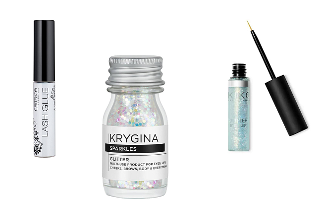 Клей для накладных ресниц, Catrice; Мультифункциональные блестки Prism, Krygina Cosmetics; Подводка для глаз гелевая с блестками в оттенке 01 Multicolour, Kiko MilanoДаже самую простую стрелку можно сделать нарядной, если добавить пару мерцающих штрихов. Например, вместе с подводкой для глаз с блестками Kiko Milano — она не оставляет липкости, белого налета и ровно ложится поверх любого продукта.