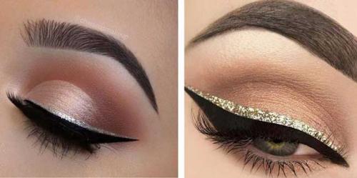 А если классика надоела, добавьте сияния. Поверх толстых черных стрелок нанесите 2-3 слоя жидкого глиттера с золотым, серебряным или металлическим блеском. Мега-свечение обеспечат 5-7 мелких стразов, наклеенных вдоль ресничного края.
