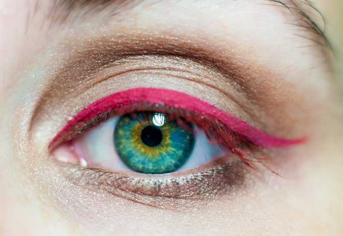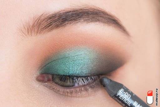 Такой эффектный вариант подойдет на каждый день. У вас должен получиться цветной наружный уголок у стрелки. Чтобы макияж выглядел красивым — подведите ватерлинию таким же оттенком.