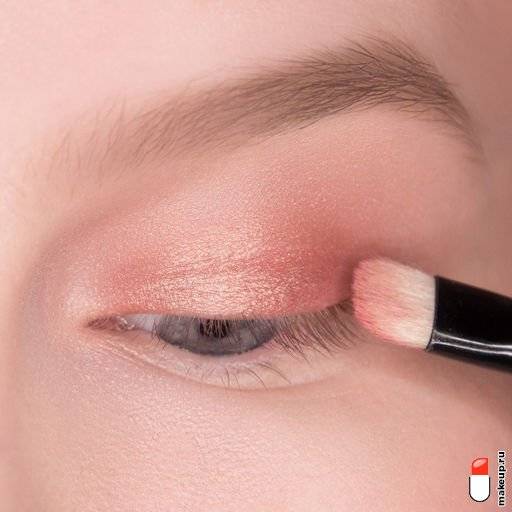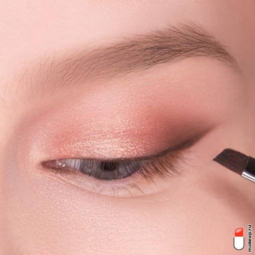Внешний уголок подчеркните нейтральными персиковыми тенями с легким шиммером. Растушуйте их по направлению к вискам.