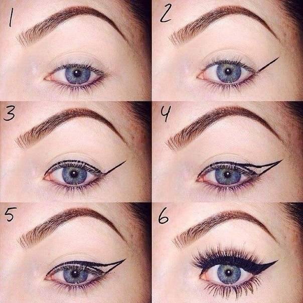 - Чтобы добавить глазам выразительность и драматизма рисуйте черные стрелки сначала карандашом, затем сверху нанесите жидкую подводку.