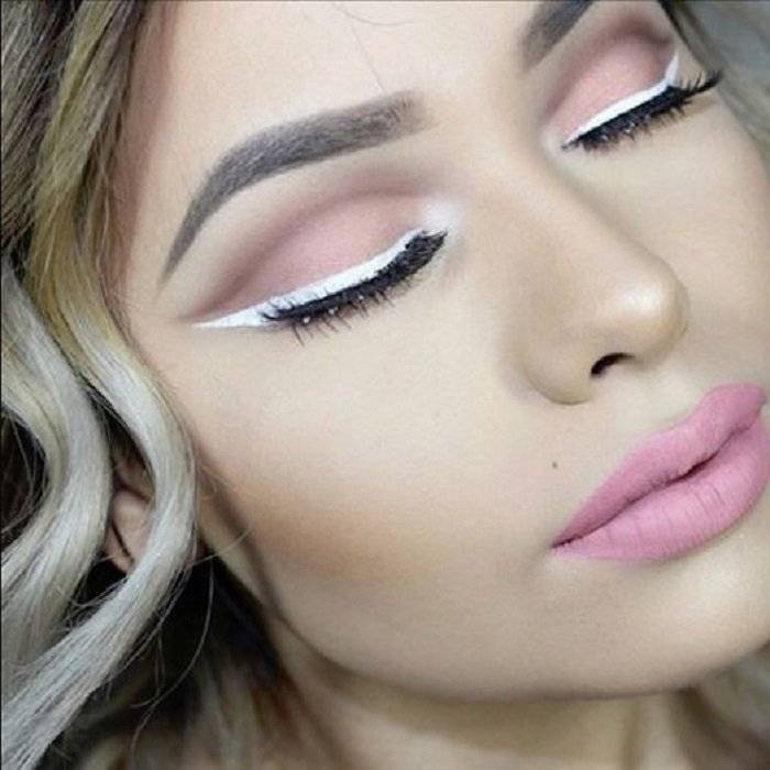2. Белые стрелки будут гармонично смотреться на дневном макияже и с подложкой из теней, вы можете выбрать любой оттенок. Например, пыльно-розовый.
