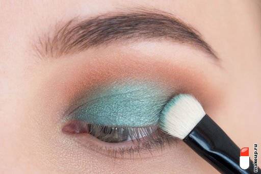 - Тонкой кистью нанесите на верхнее и нижнее веко тени на тон темнее основного цвета.