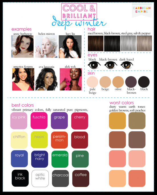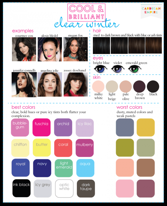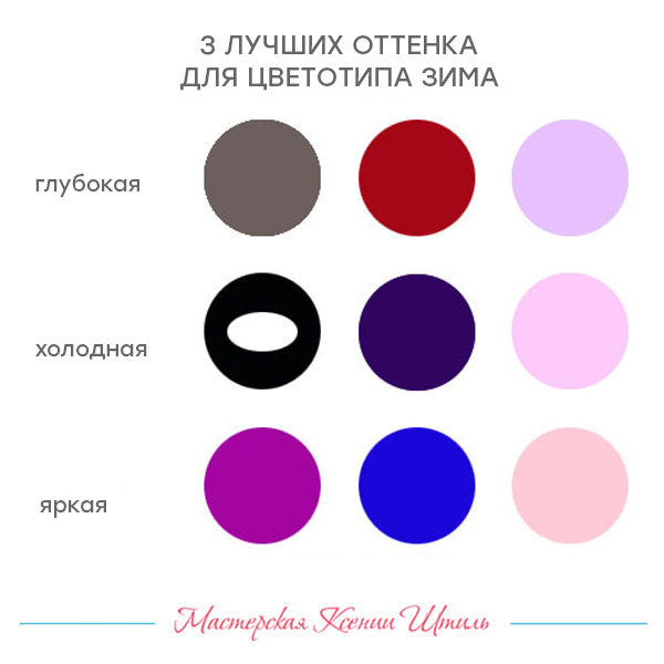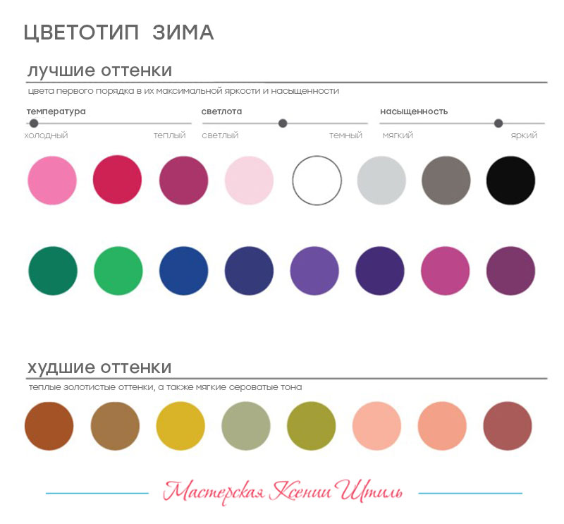 К тому же, имеет цветотип зима подтипы для более точного определения и безошибочного подбора цветовой палитры