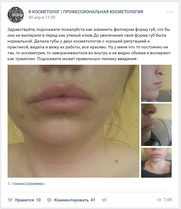 Еще один пример из профессиональной группы «Я косметолог», от клиентки: