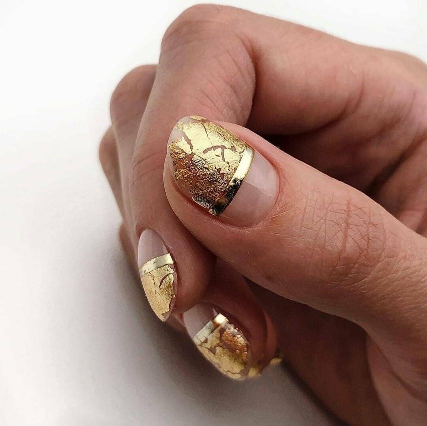 - Кусочек золотой переводной фольги приложите к ногтевой пластине и аккуратно распределите по ногтевой пластине салфеткой или ватной палочкой, слегка прижимая фольгу к ногтю. Блестящий материал можно наложить как на свободную часть ногтя, если позволяет длина, так и на всю ногтевую пластину.