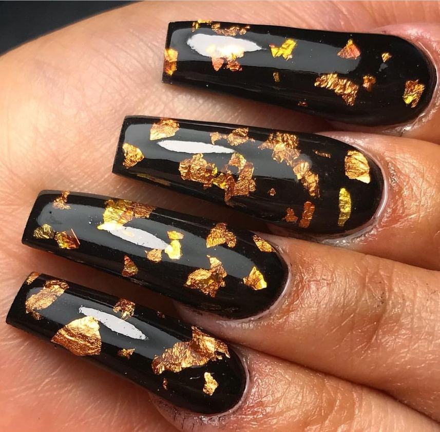 Если вы работаете с непереводной фольгой, то для начала нужно вырезать узор, а после накладывать его на лак и покрыть закрепителем. Оригинально будет смотреться маникюр, если порвать фольгу на меленькие кусочки, и с помощью обычной зубочистки выложить мозайку на свое усмотрение. Вы можете использовать не только липкий гель и акрил, но и обычный лак. Такую фольгу можно применять при наращивании, обычно ее используют при создании аквариумного дизайна. В результате у вас может получится самый разный дизайн, начиная от золотого и до дерзкого черного.
