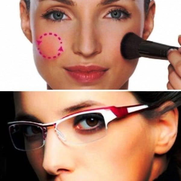 - Используя специальную кисть, нанести на скулы румяна. Если в повседневной жизни вы пользуетесь очками, обрабатывать кожу румянами стоит, надев этот аксессуар на себя.