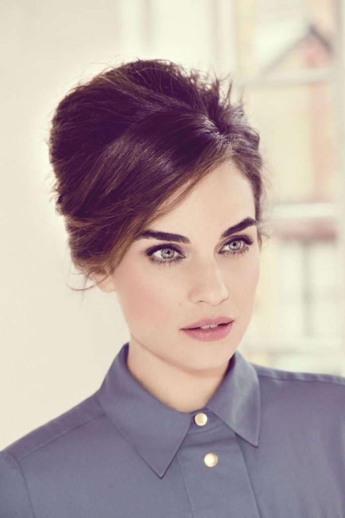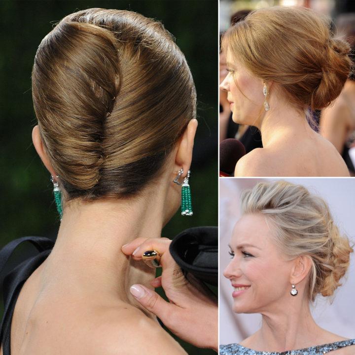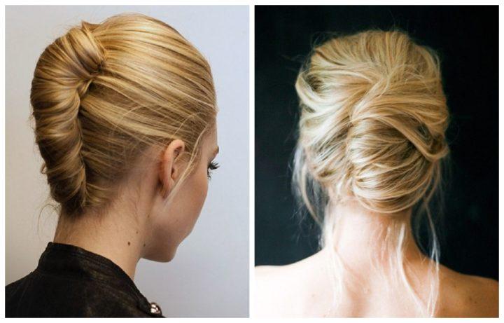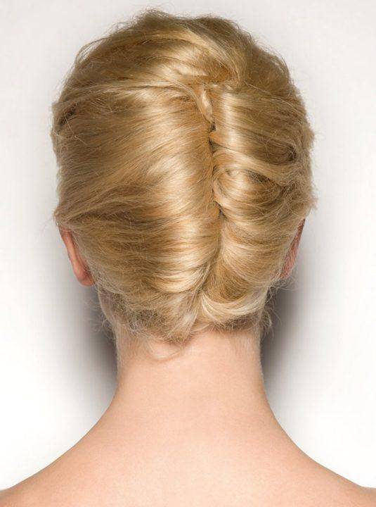 Такая прическа отлично держится на не слишком пышных волосах. Если требуется укротить пряди, используйте легкую пену без эффекта мокрых волос. Заколку для такой прически подберите классической формы под цвет волос или в тон костюму.