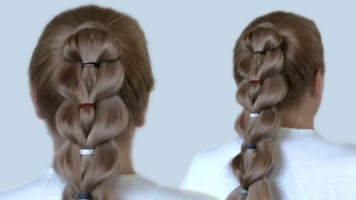 Процедуру нужно проделать дважды и зафиксировать, используя резиночку возле окончания волос. Для выполнения данной прически с силиконовыми резинками, используйте тонкие, но прочные резиночки.