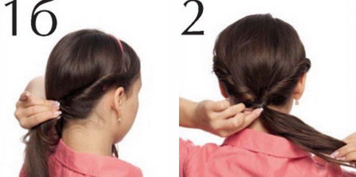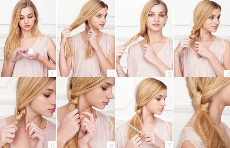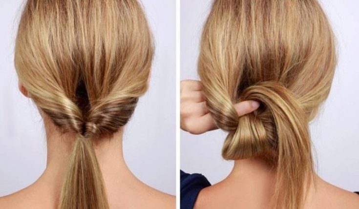 Вывернутый хвостик. Необходимо нанести ополаскиватель на чистые пряди и просушить. После этого нужно подобрать не туго локоны в хвост, расположенный невысоко, поделить волосы у резиночки надвое и вдеть в нее кончик хвостика, выворачивая его наизнанку.