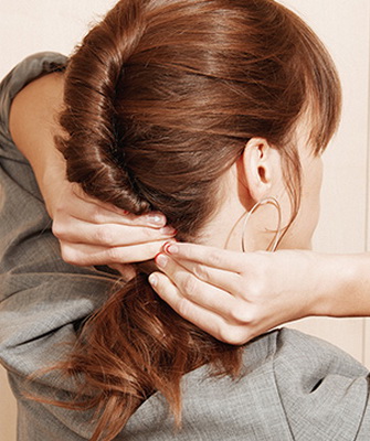 Узелковый хвост – это наиболее женственный, даже романтический вариант офисной укладки. Необходимо предварительно помыть голову, высушить ее и нанести подходящее по типу прядей укладочное средство. Затем пряди собираются набок, делятся надвое и связываются двумя узлами – остается только зафиксировать их и подправить прядки.