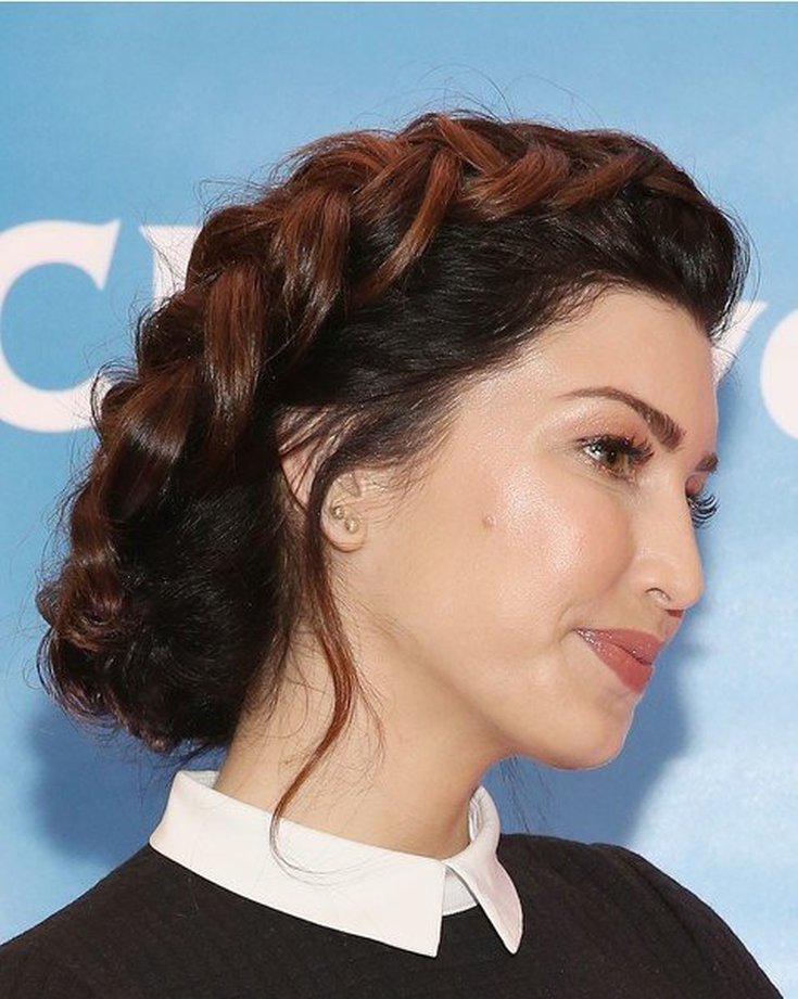 Ободок. Это очень эффектная и нежная прическа из косичек, которая подойдет обладательницам гладких и вьющихся прядей. С боков нужно отделить по пряди, которые расположены максимально близко к вискам, и сплести косы. Затылочную область следует начесать, сформировать ободок из кос и зафиксировать заколками. Плетение может быть разнообразным.