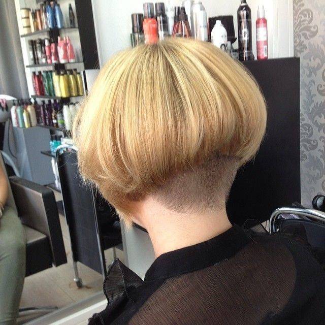 Еще один эффектный вариант короткой стрижки с объемной макушкой. Главная особенность заключается в оригинальной форме. Подобная прическа внешне напоминает гриб: короткие волосы на затылке плавно переходят в более длинные. Достигается этот эффект за счет ровного среза и выделяющегося мысика. В итоге получается пышная шапка (как шляпка у гриба) сверху и коротенькие волосы на затылке (словно ножка).