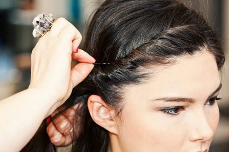 Способ №2. Этот способ подходит тем, кто интересуется, как красиво заколоть распущенные волосы. Необходимо взять по две небольшие прядки у левого и правого виска, закрутить их в жгутики у основания.
