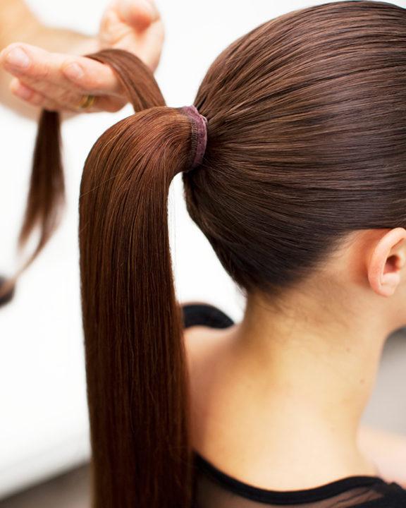 2. Свяжите волос резинкой и сформируйте вывернутый хвост.