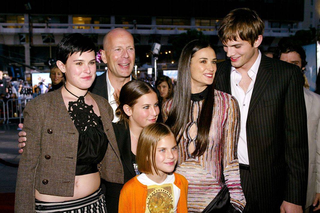 Брюс Уиллис, актриса Деми Мур с дочерьми Румер, Скаут и Таллулой, Эштон Катчер на премьере фильма «Ангелы Чарли: Только вперёд» в Голливуде, 27 июня 2003 г.