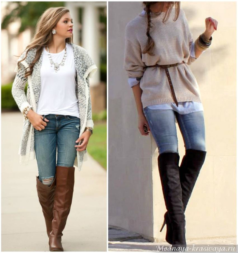 Подойдет клеш от бедра, от колена, прямые модели. Все то же самое касается и джинсов. Бойфренды и скинни подходят с большой оговоркой. Слишком узкие штанины лучше заправить в сапоги или компенсировать недостаток объема на щиколотках грубоватыми ботинками.