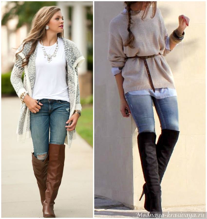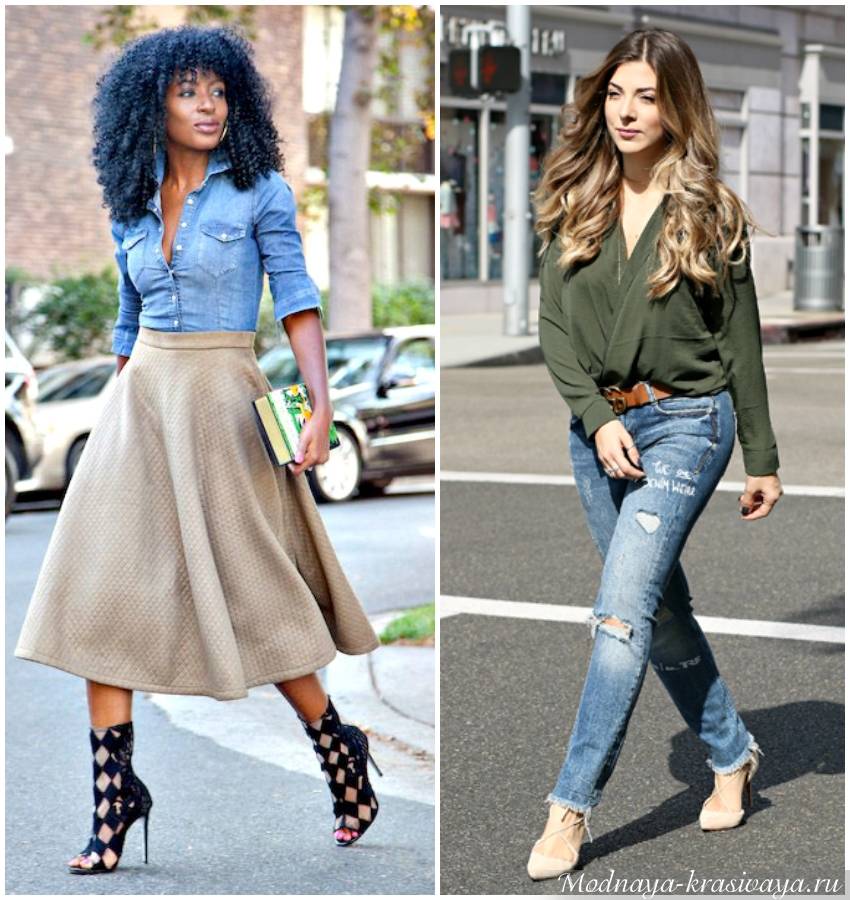 Подойдет клеш от бедра, от колена, прямые модели. Все то же самое касается и джинсов. Бойфренды и скинни подходят с большой оговоркой. Слишком узкие штанины лучше заправить в сапоги или компенсировать недостаток объема на щиколотках грубоватыми ботинками.