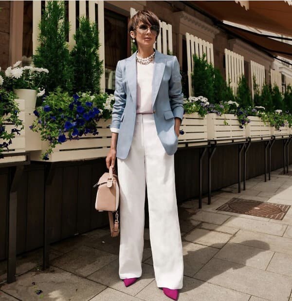 Для дамы после 40 лет в качестве повседневной одежды можно выбирать верх с проймой-американкой или одежду с прозрачными и полупрозрачными объемными рукавами. Это поможет визуально расширить верхнюю часть, но не будет восприниматься как стремление «молодиться».То же касается и ярких оттенков. Если юные девушки могут выбирать ярко-красные, розовые, желтые топы, пиджаки и кардиганы, то зрелым женщинам лучше делать эти же цвета более благородными и приглушенными – не ярко-красный пиджак, а темно-вишневый, оттенка марсала, не канареечно-желтая блуза, а горчичного или оливкового оттенка.