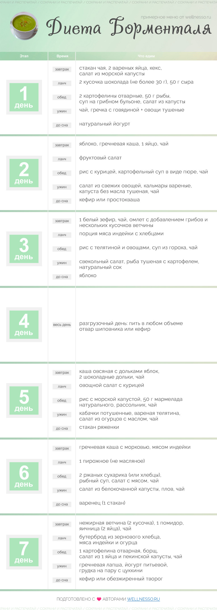 С помощью ориентировочного меню на неделю по системе питания доктора Борменталя можно убедиться, что эта диета довольно «вкусная» и питательная.