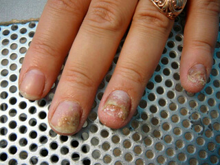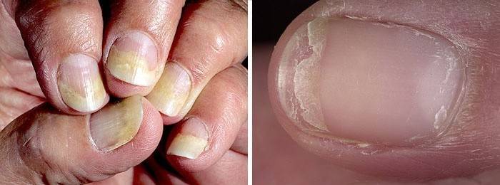 Ногтевой пластина разрушается, образуются трещины. Поверхность ногтя расслаивается, и начинается воспалительный процесс близлежащих тканей эпидермиса.