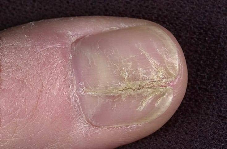 На свободном крае ногтя появляется трещина, которая при отсутствии терапии, поднимается до корневой части пластины.
