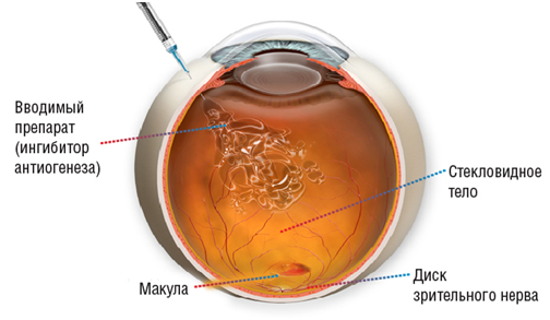 Интравитреальной введение ингибиторов ангиогенеза в настоящее время является золотым стандартом лечения влажной формы ВМД. Препараты тормозят патологический рост кровеносных сосудов и предотвращают пропотевание крови из них. Это может помочь остановить дальнейшее повреждение сетчатки, сохранить существующие зрительные функции, а в ряде случаев улучшить зрение. В нашей клинике применяются следующие ингибиторы ангиогенеза: