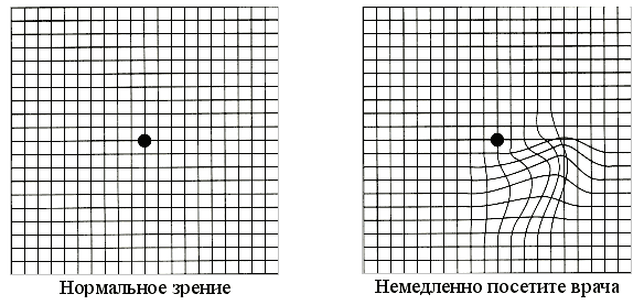 Не всегда легко заметить, что зрение одного из глаз снизилось. По этой причине мы рекомендуем Вам проверять зрение каждого глаза по отдельности. Одним из важных методов самоконтроля пациентов является сетка Амслера, для выяления ранних признаков заболевания.