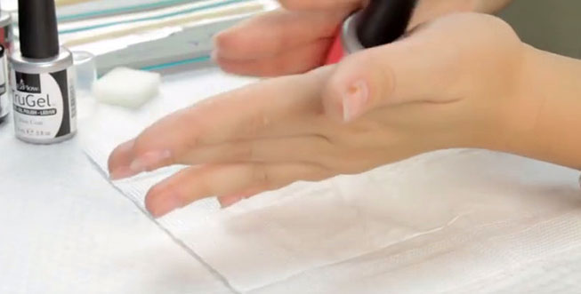 Для этого ногти достаточно протереть дезинфектором или средством для снятия лака с содержанием ацетона. Протирать нужно тщательно торец и боковые стороны ногтя.